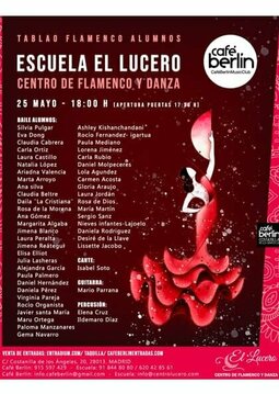El próximo domingo 25 de Mayo 18 horas en la sala Café Berlín, os esperan en una velada muy flamenca, los alumnos de Baile, Cante y Percusión del Centro de Flamenco y Danza El Lucero , donde mostrarán parte de su aprendizaje del curso!